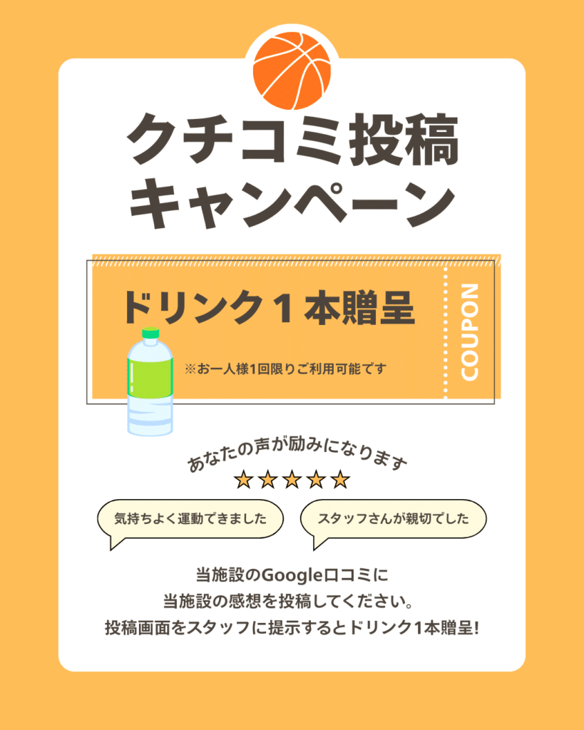 ・ご利用時にクチコミ投稿してスタッフに投稿画面を提示していただいた方にドリンク1本贈呈